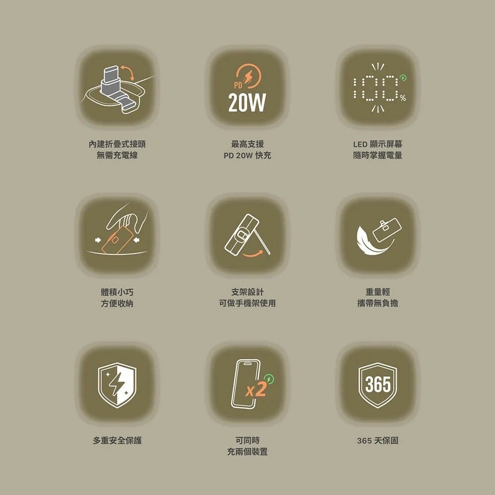 ●獨特可折疊 USB-C 接口,無需自備充電線材,即插,就來電,隨時支援設備充電。