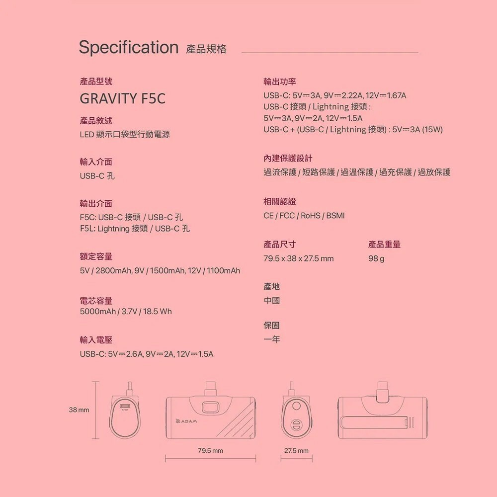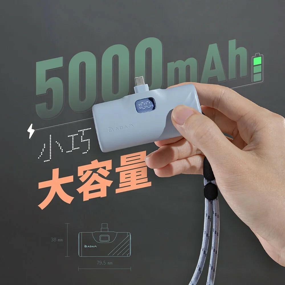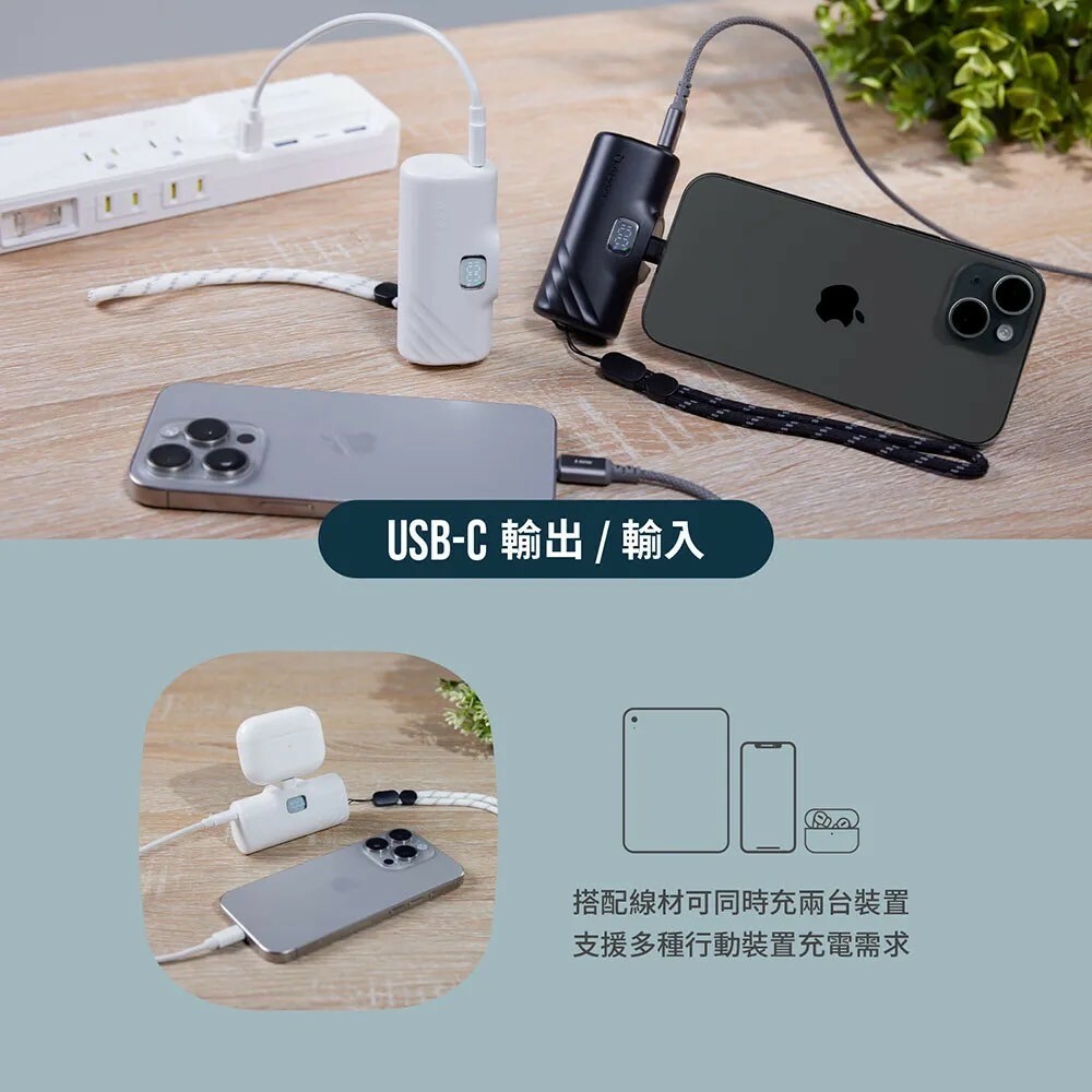 ●5000 mAh 行動電源,支援快充,可同時支援兩個設備充電,單孔最高輸出可達20W 。