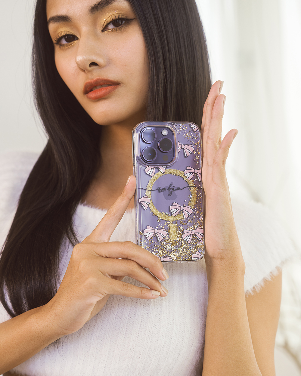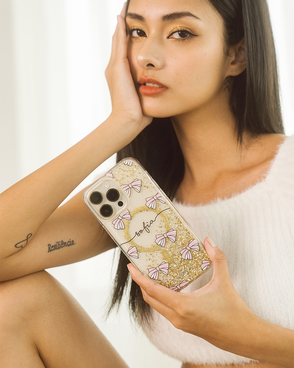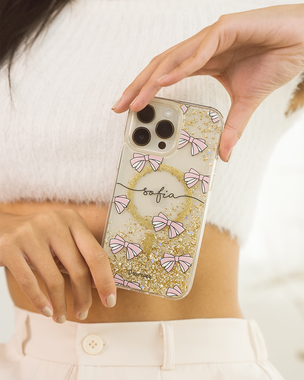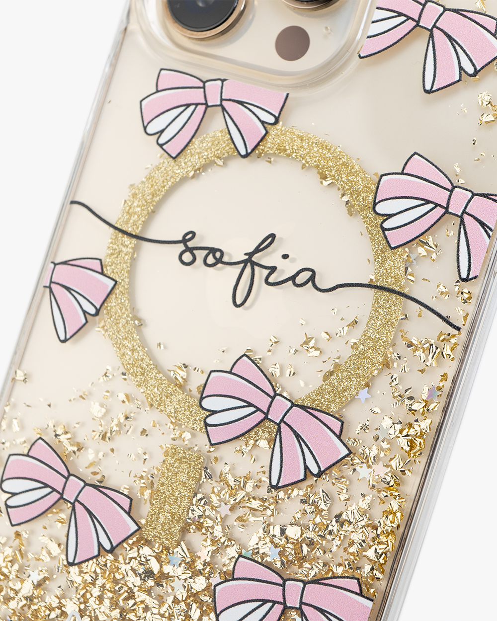 粉蝴蝶結 香檳金貝拉殼 (MagSafe) - (訂製名字) iPhone客製化手機殼