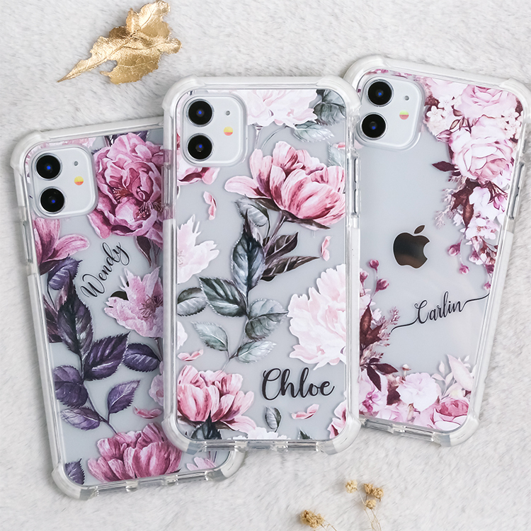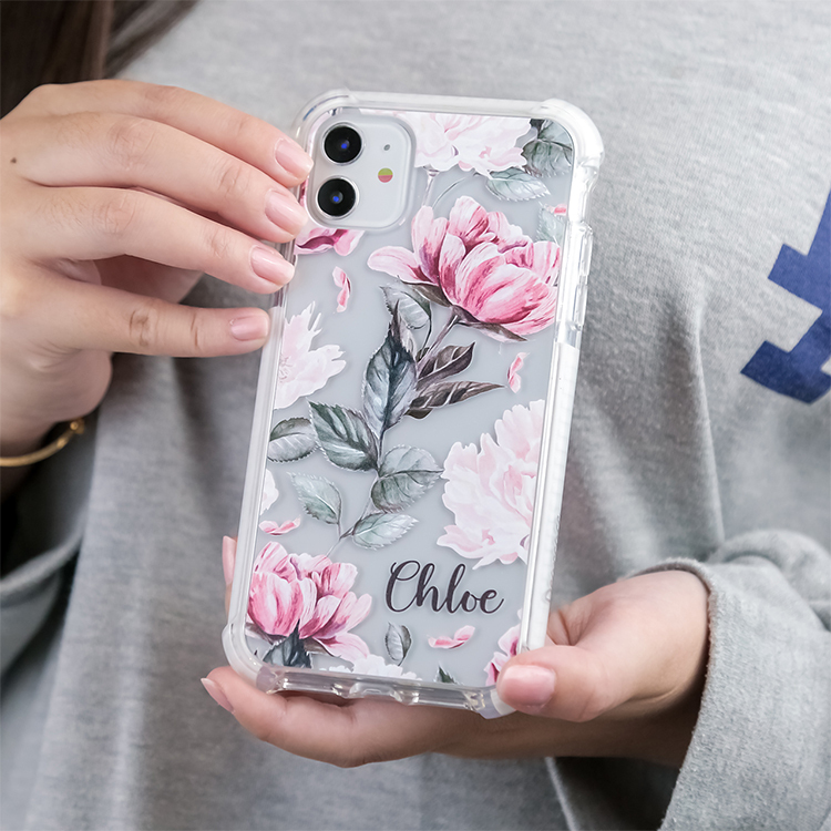 藕色牡丹 撞白殼 - (訂製名字) iPhone客製化手機殼