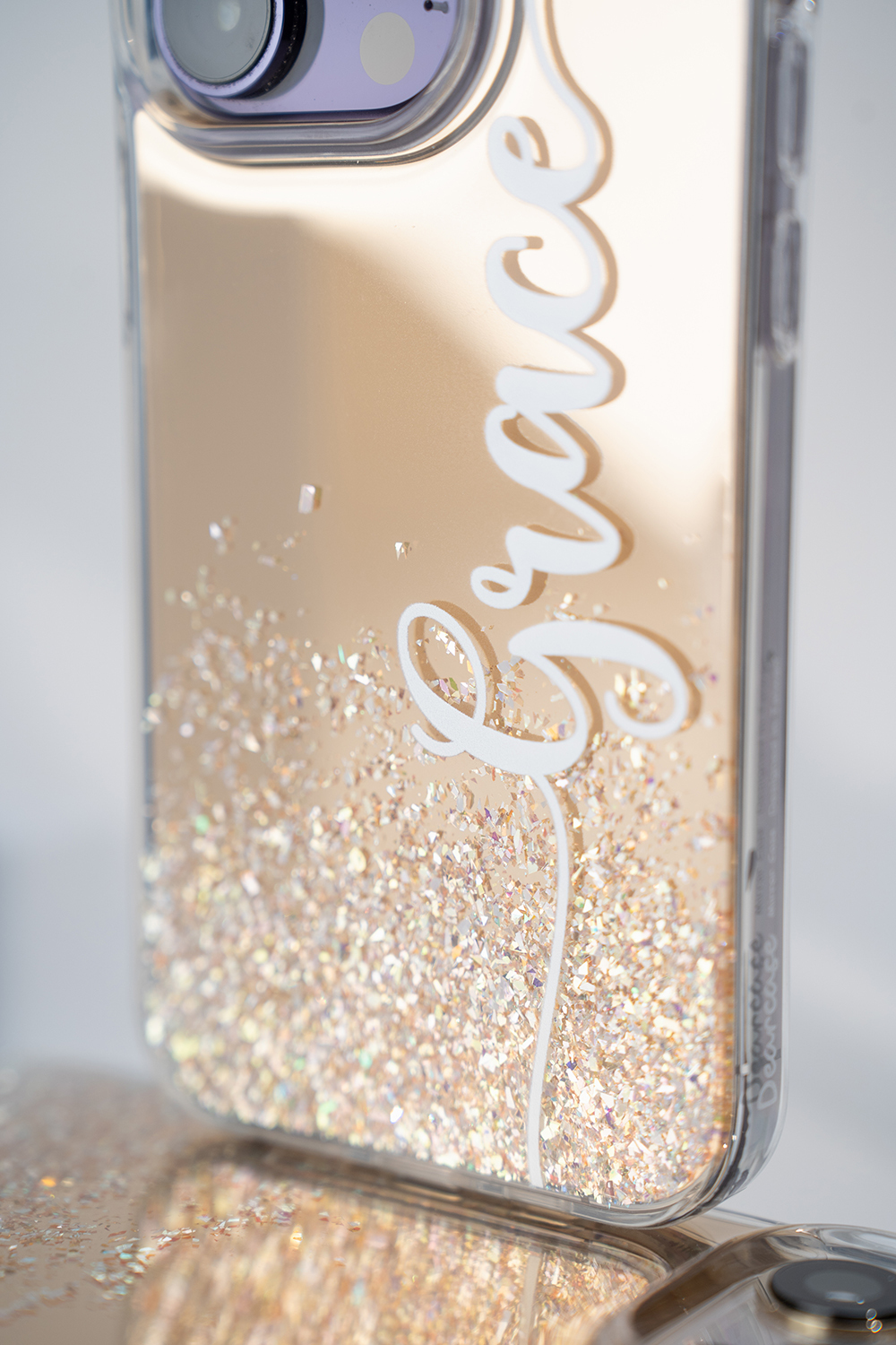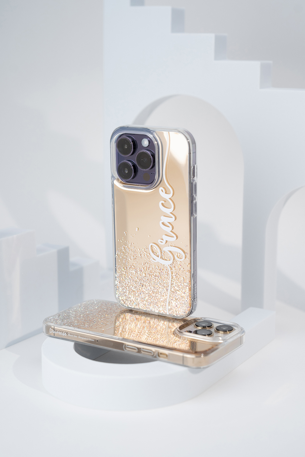 • 閃耀亮粉為自然分佈排列鏡面手機殼