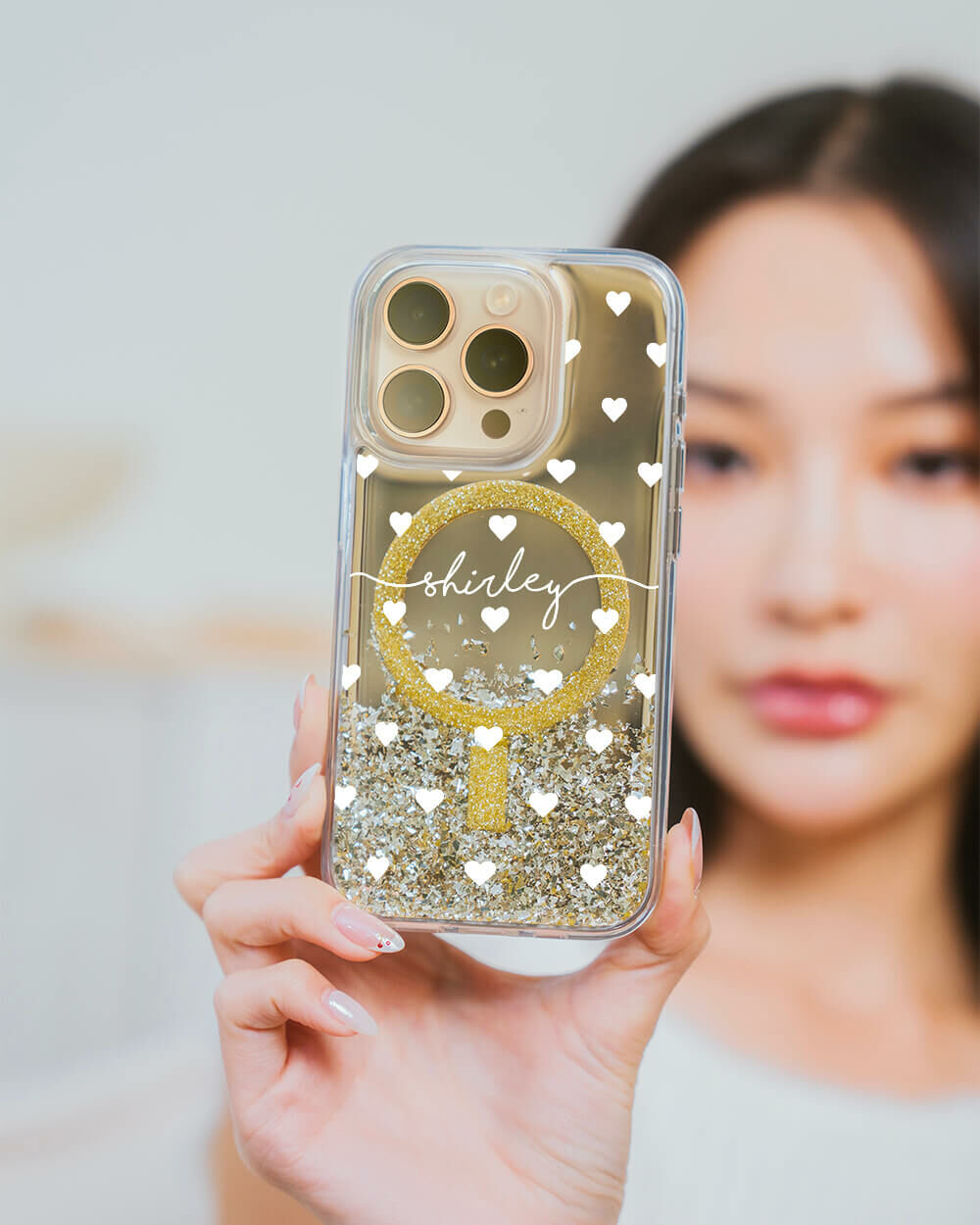 白色愛心 (MagSafe磁吸) 閃耀金鏡面殼 - (訂製名字) iPhone客製化手機殼