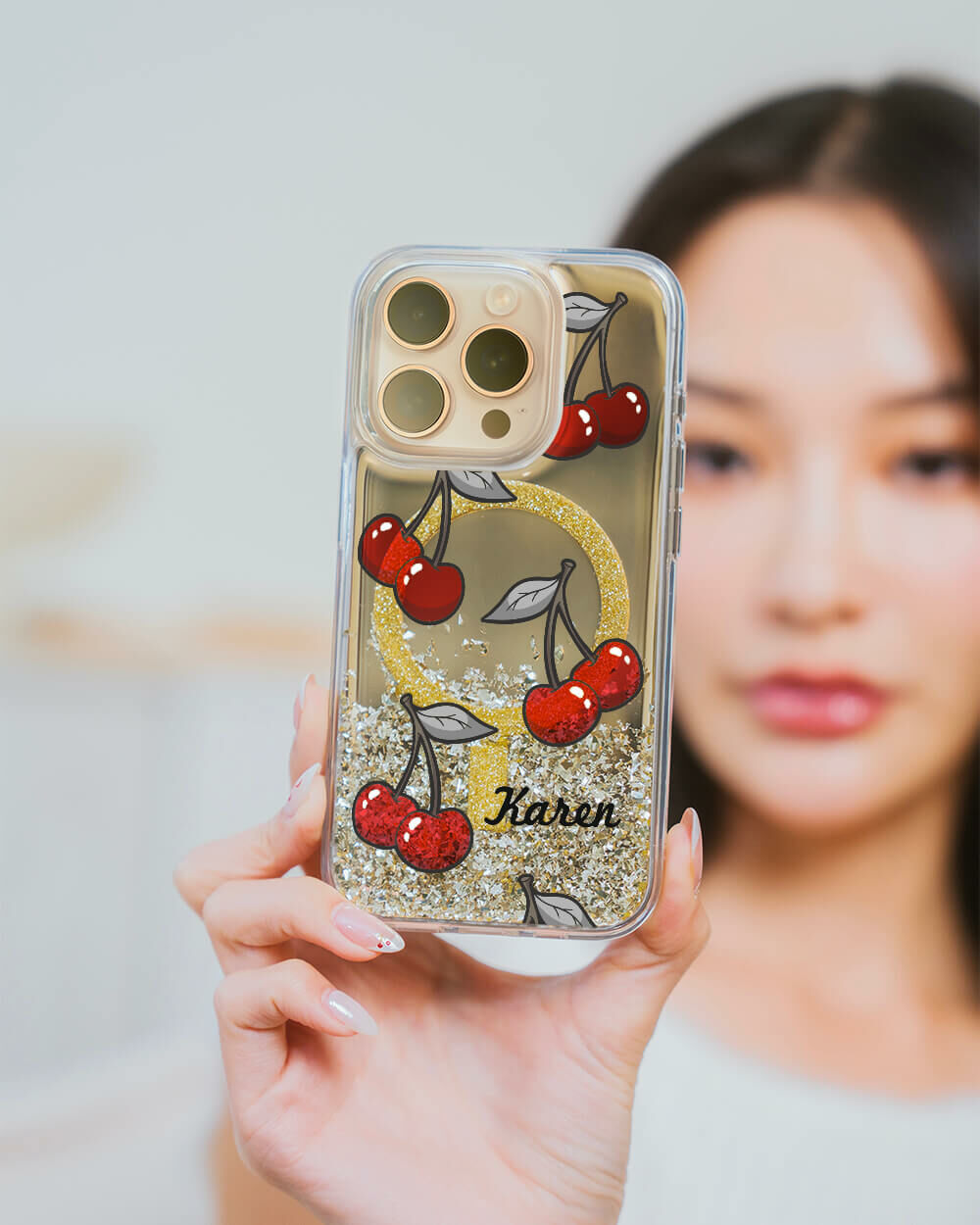 俏皮櫻桃 (MagSafe磁吸) 閃耀金鏡面殼 - (訂製名字) iPhone客製化手機殼
