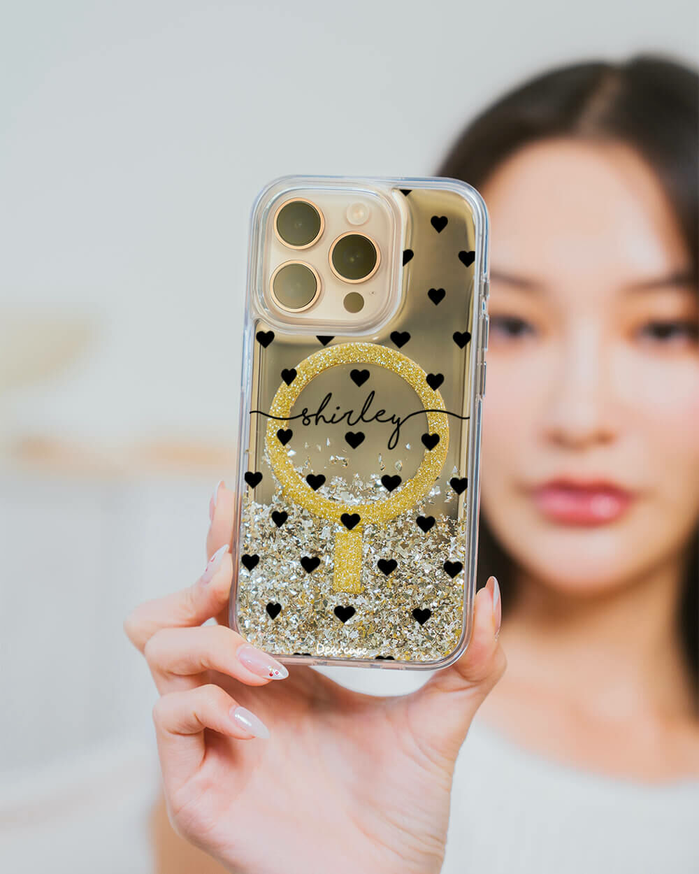 黑色愛心 (MagSafe磁吸) 閃耀金鏡面殼 - (訂製名字) iPhone客製化手機殼