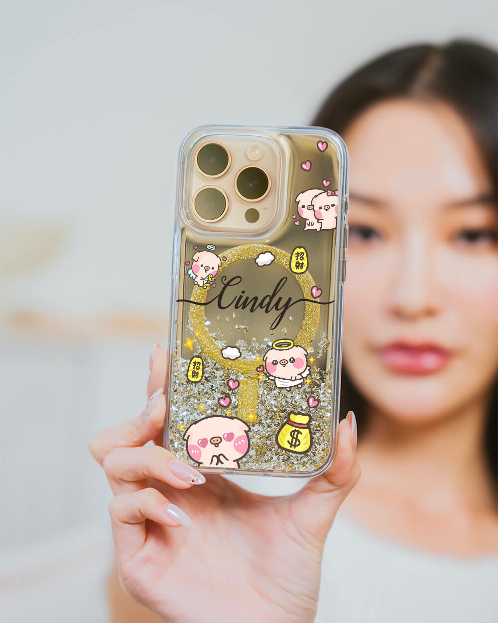 滿滿萌萌豬 (MagSafe磁吸) 閃耀金鏡面殼 - (訂製名字) iPhone客製化手機殼