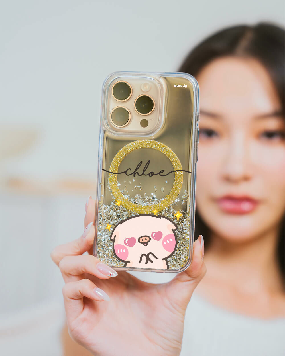 黑皮萌萌豬 (MagSafe磁吸) 閃耀金鏡面殼 - (訂製名字) iPhone客製化手機殼
