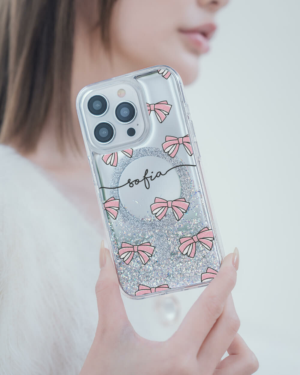 粉蝴蝶結 (MagSafe磁吸) 閃耀鏡面殼 - (訂製名字) iPhone客製化手機殼
