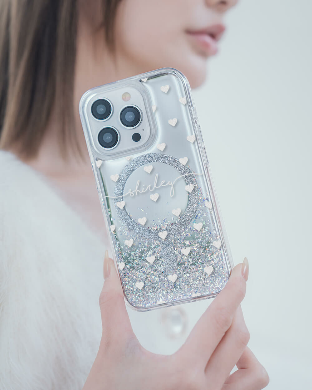 白色愛心 (MagSafe磁吸) 閃耀鏡面殼 - (訂製名字) iPhone客製化手機殼