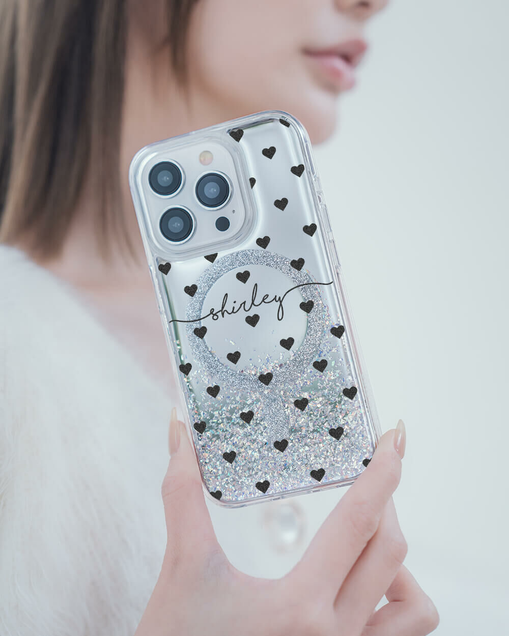 黑色愛心 (MagSafe磁吸) 閃耀鏡面殼 - (訂製名字) iPhone客製化手機殼