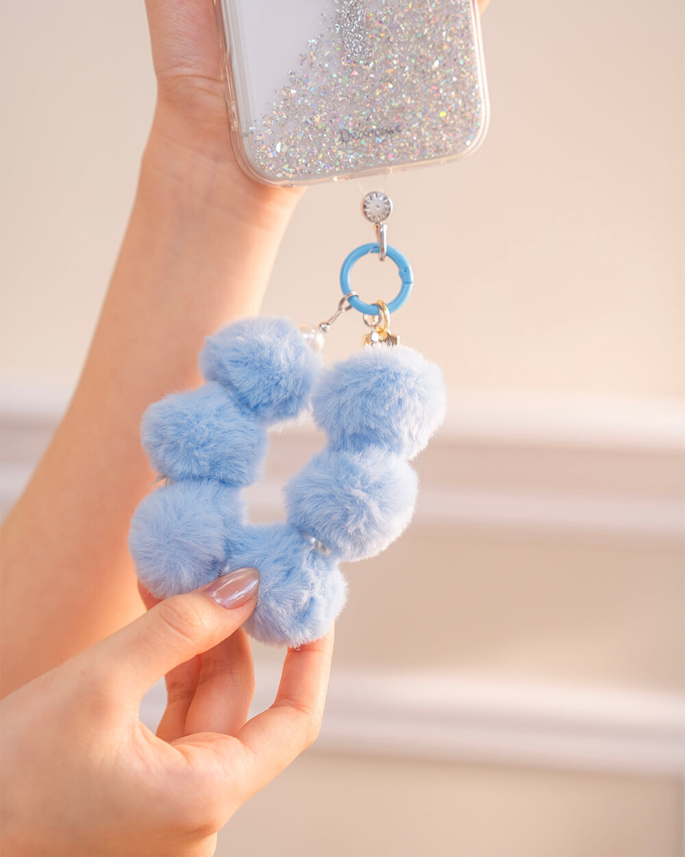 可愛毛毛球珍珠 (寶寶藍) 手腕繩 短掛繩 手機掛繩 毛球 手機提鍊
