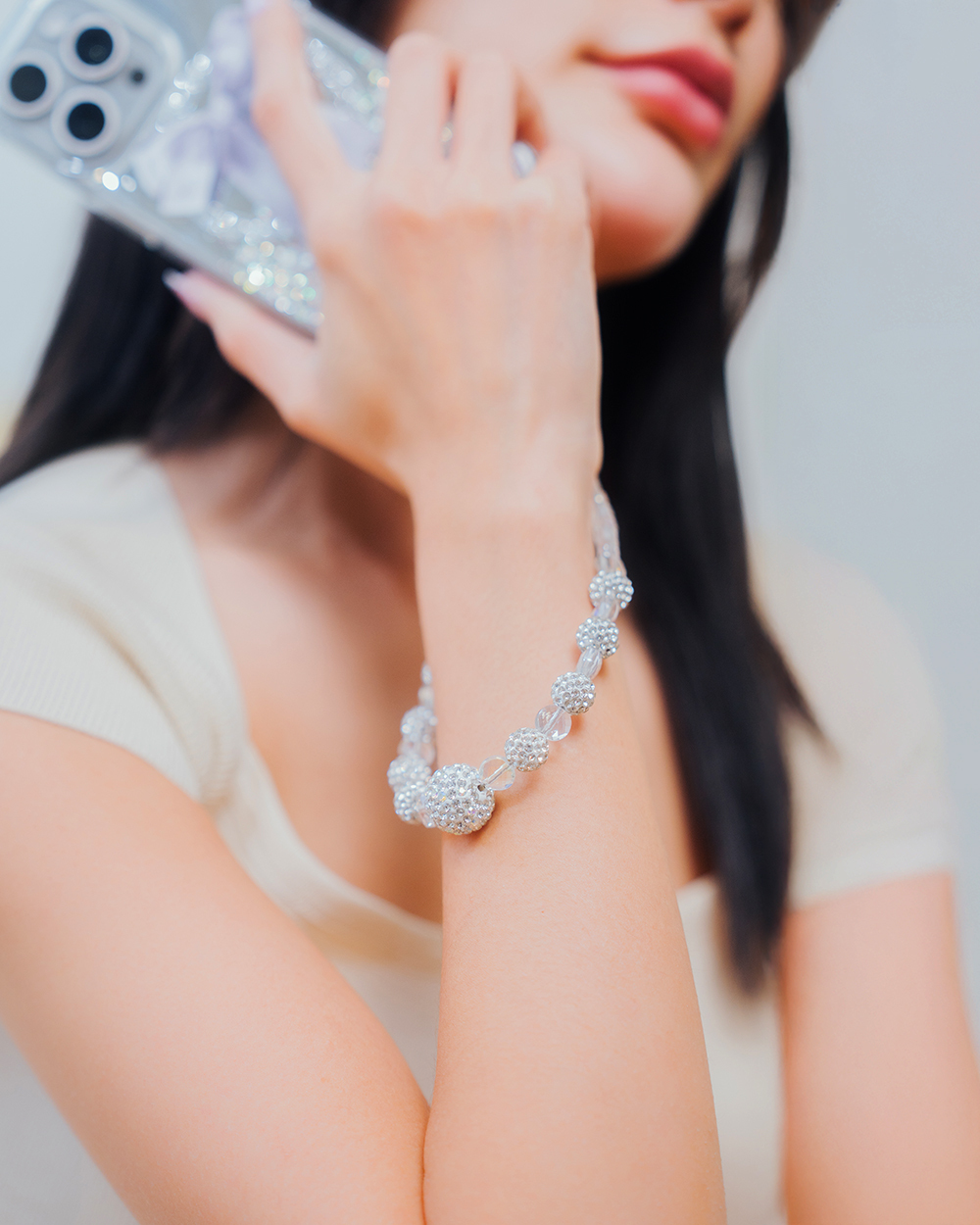 氣質冰塊水晶鑽 (透白) 串珠手腕繩 短掛繩 串珠掛繩 手機掛繩