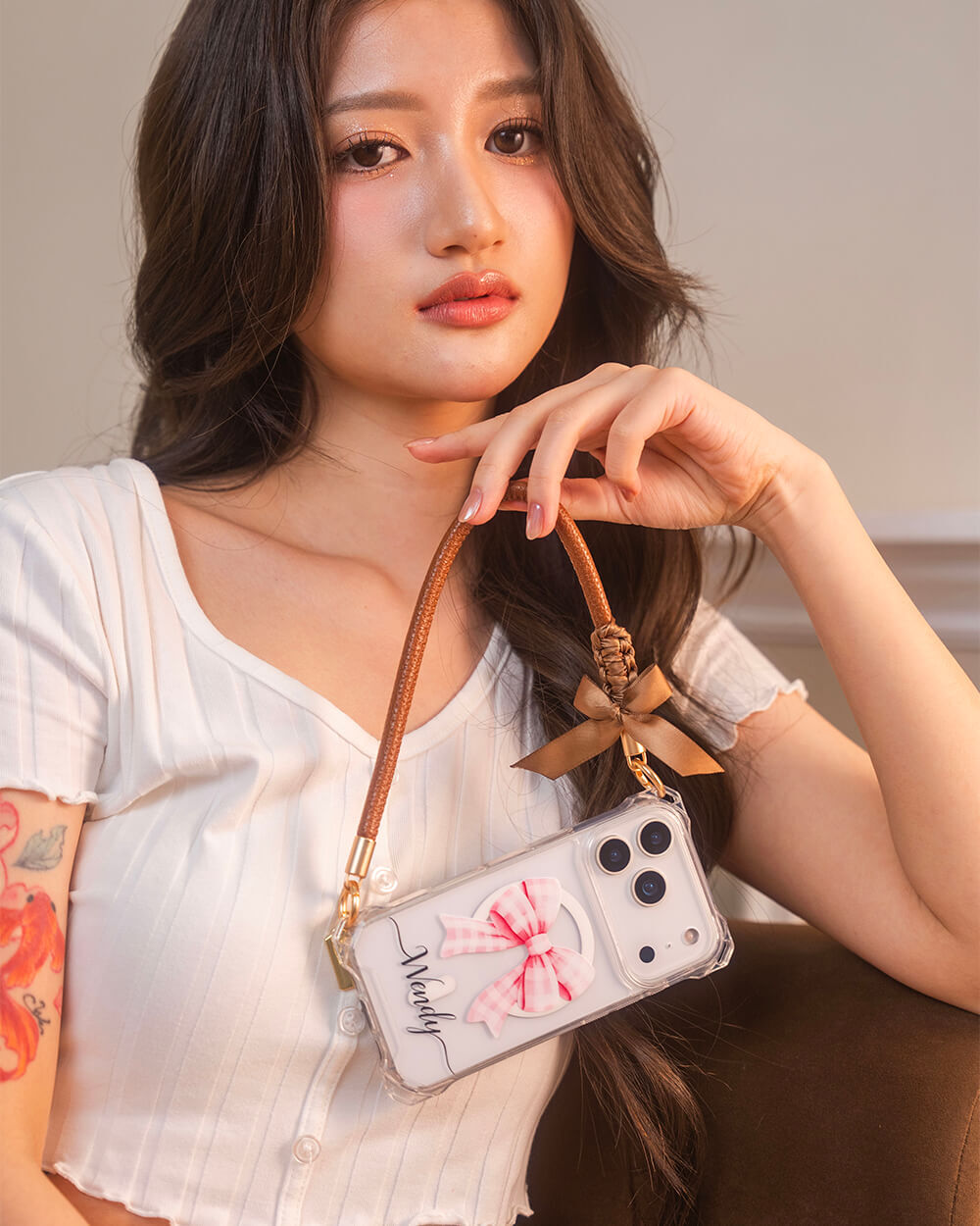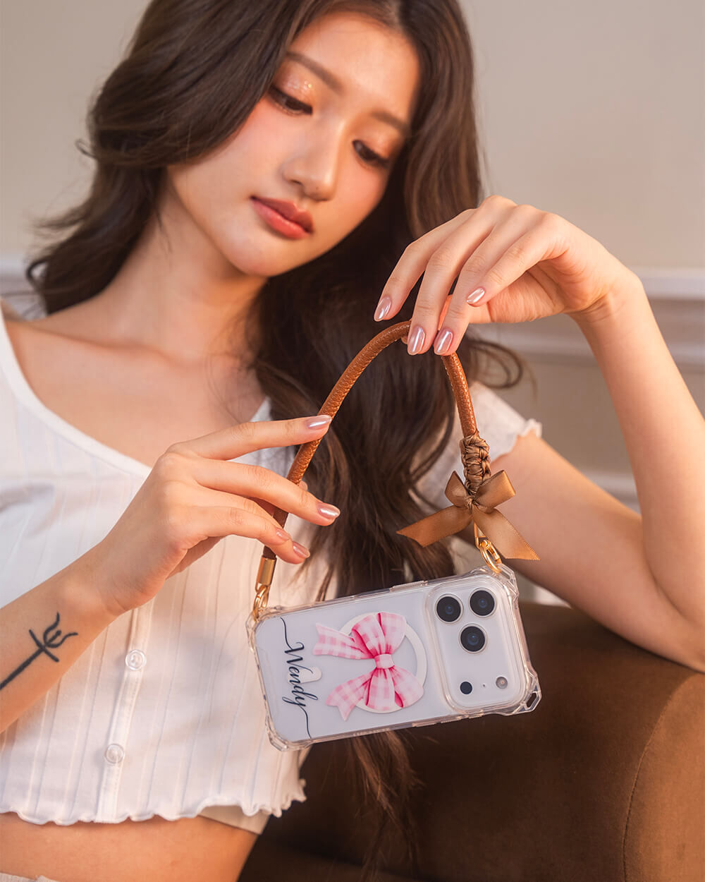 蝴蝶結緞帶皮革繩 (棕咖) 皮革手腕繩 手機掛繩 短掛繩