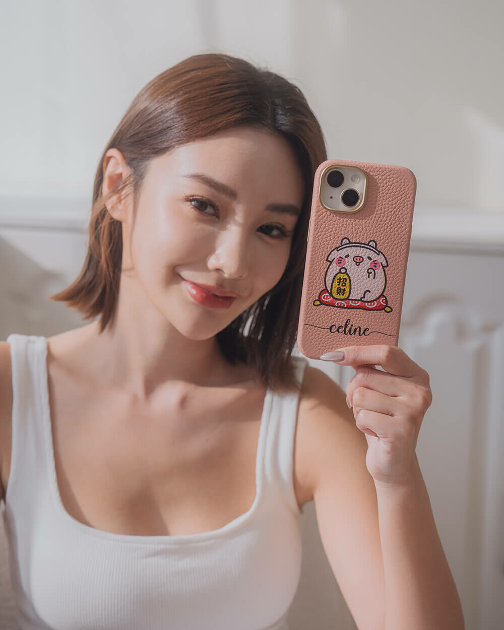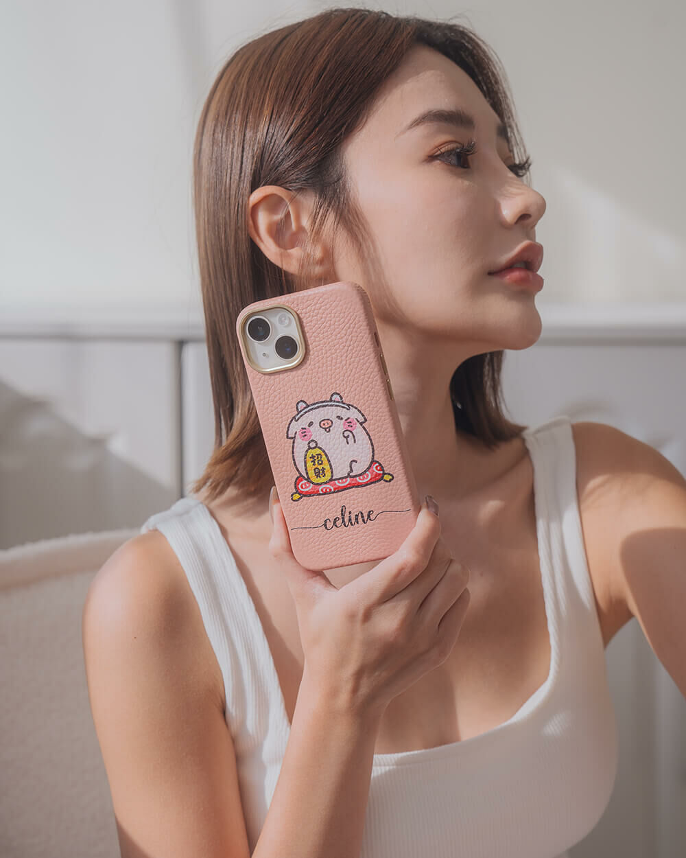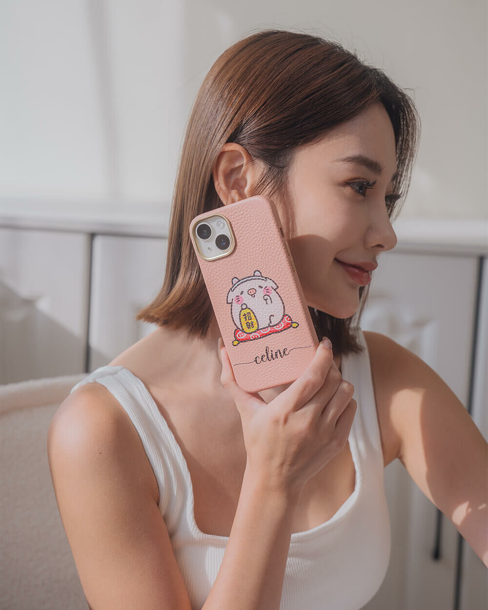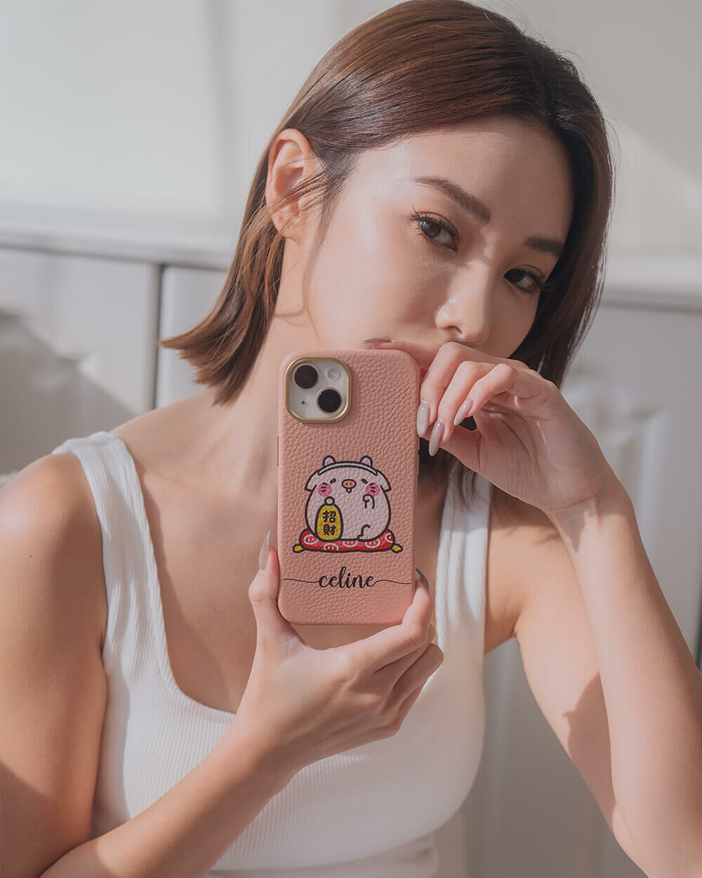 【插畫聯名】萌萌豬 我要招財 蜜荔殼 蜜荔粉皮革殼 - (訂製名字) iPhone客製化手機殼