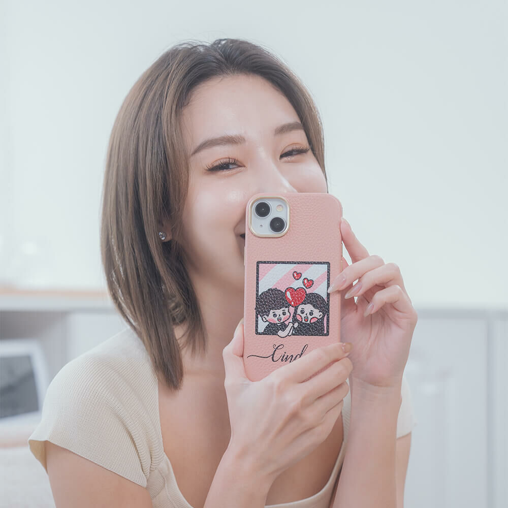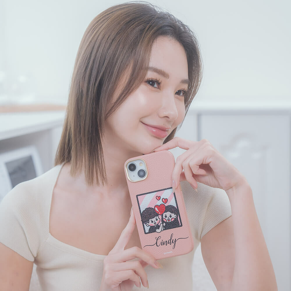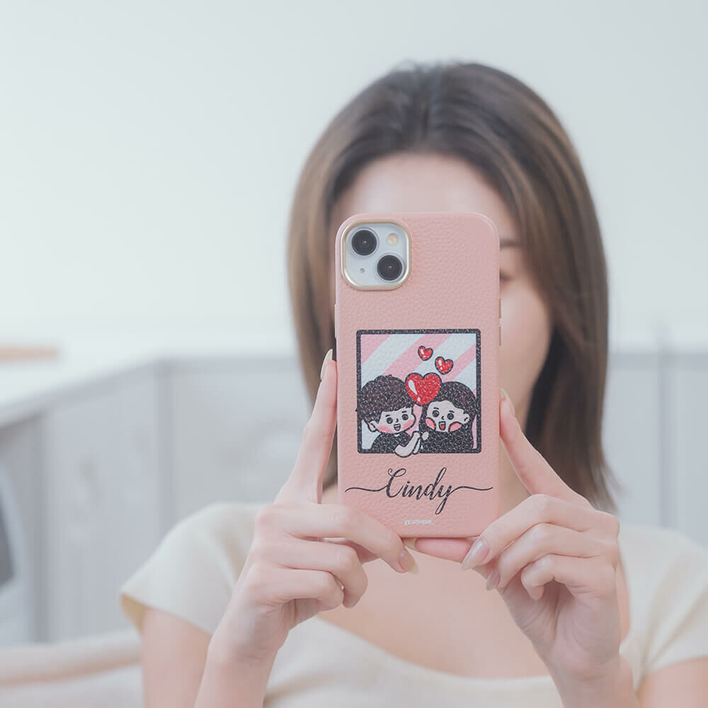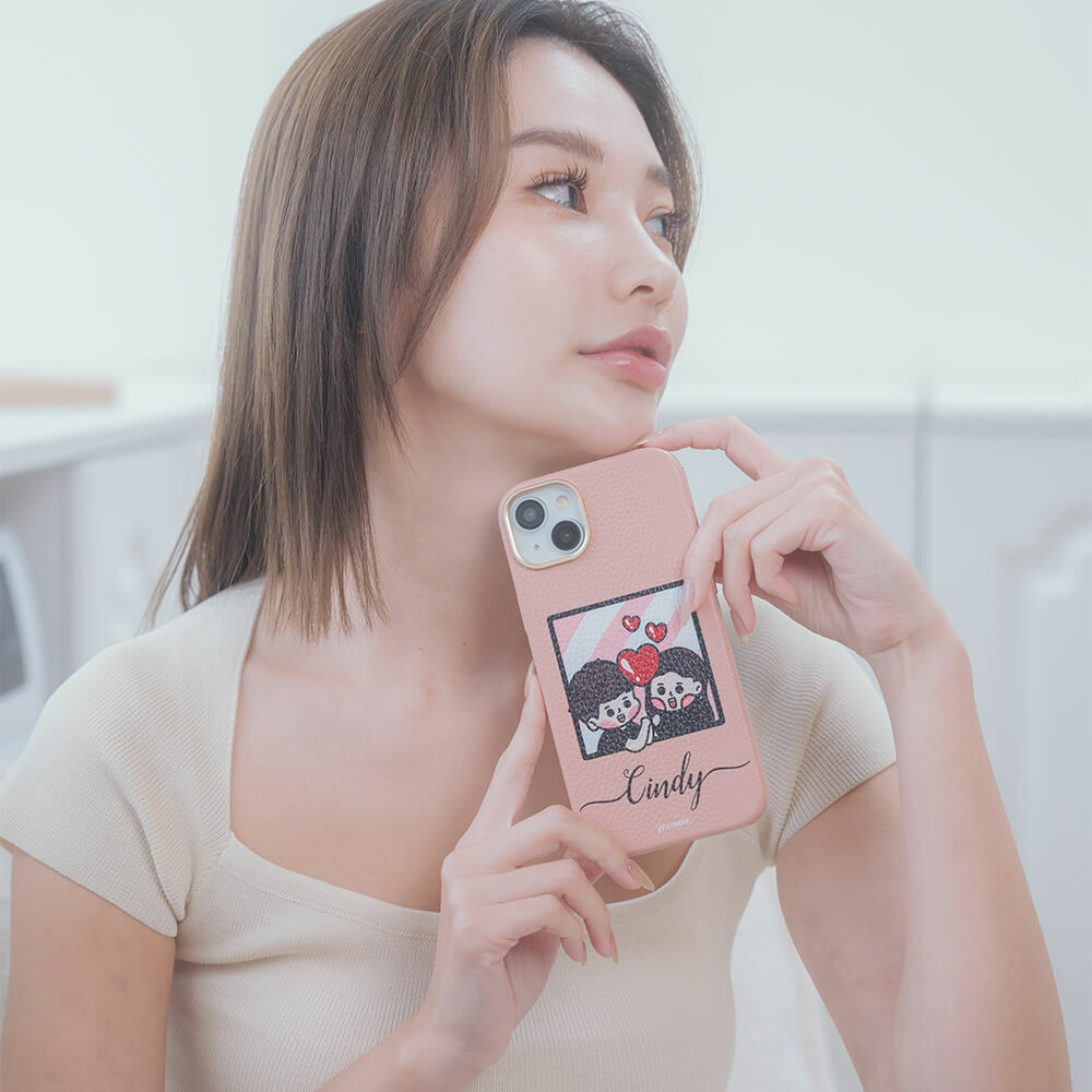 【插畫聯名】挖系小y 戀愛腦情侶 蜜荔粉皮革殼 - (MagSafe) (訂製名字) iPhone客製化手機殼
