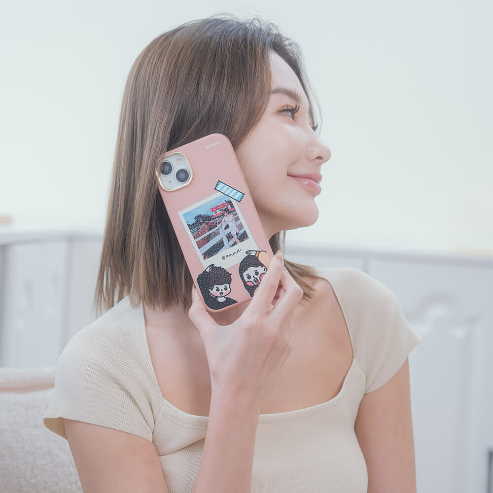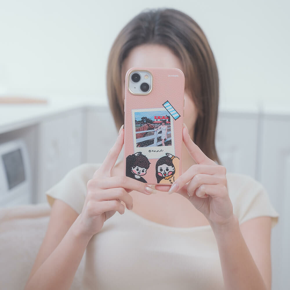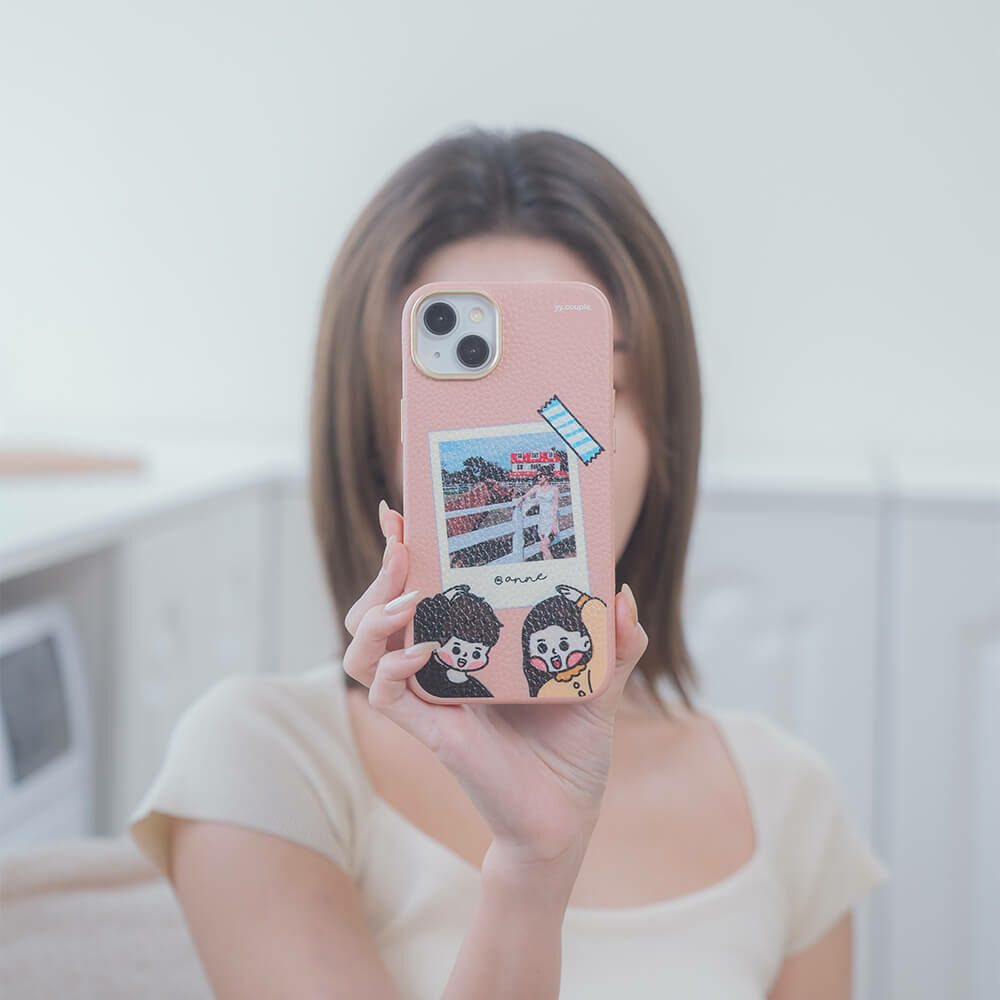 【插畫聯名】挖系小y 幸福情人 蜜荔粉皮革殼 - (MagSafe) (訂製名字) iPhone客製化手機殼