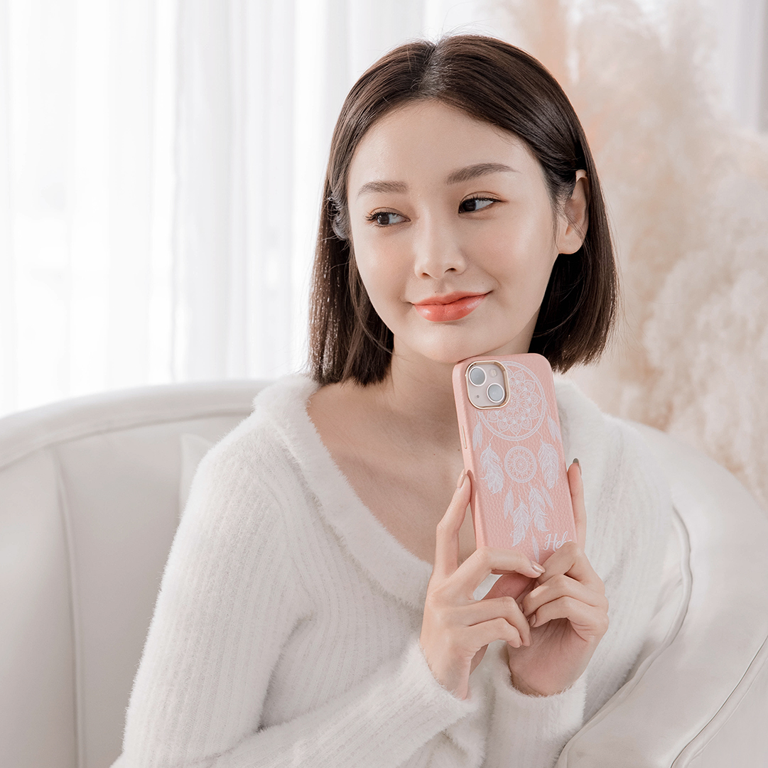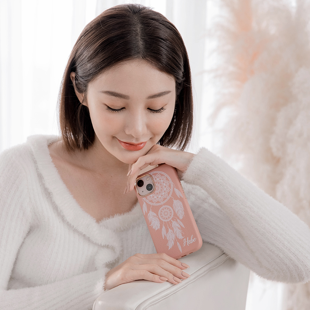 白色捕夢網 蜜荔殼 蜜荔粉皮革殼 - (訂製名字) iPhone客製化手機殼