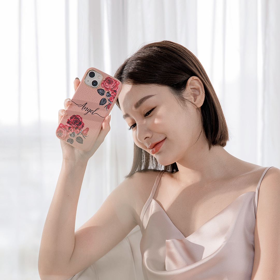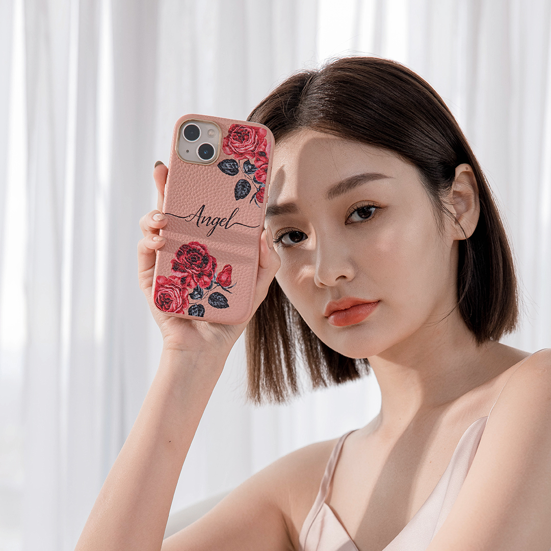 刺繡玫瑰 蜜荔殼 蜜荔粉皮革殼 - (訂製名字) iPhone客製化手機殼