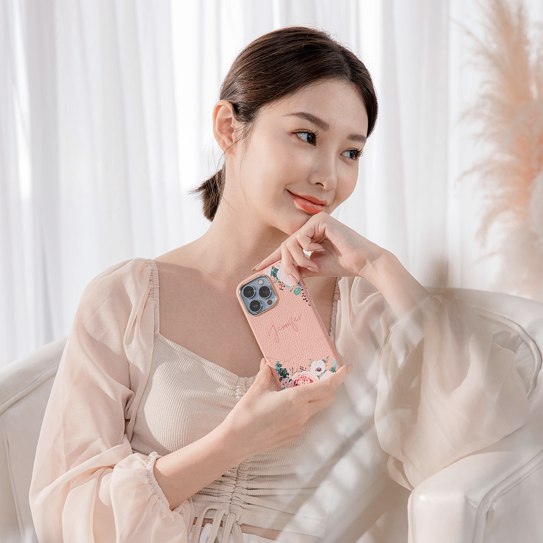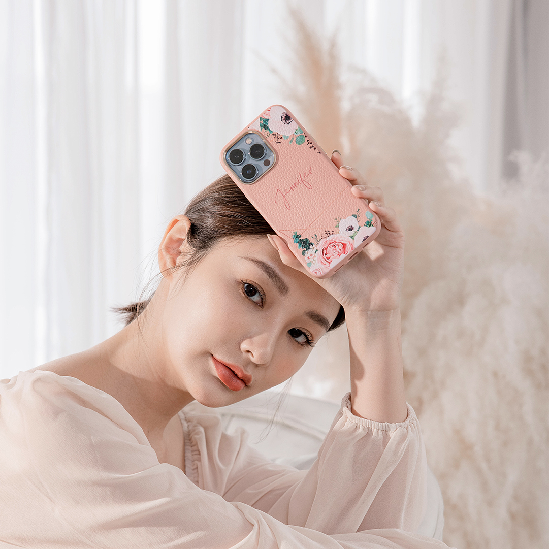 幾何玫瑰 蜜荔殼 蜜荔粉皮革殼 - (訂製名字) iPhone客製化手機殼