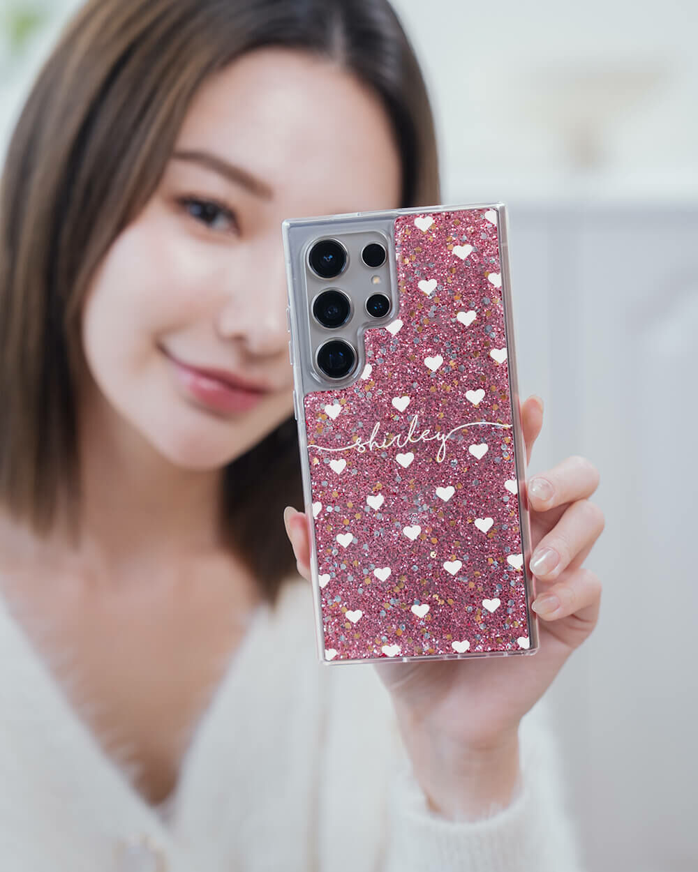 白色愛心 粉耀貝拉殼 - (訂製名字) - Samsung 三星 客製化手機殼
