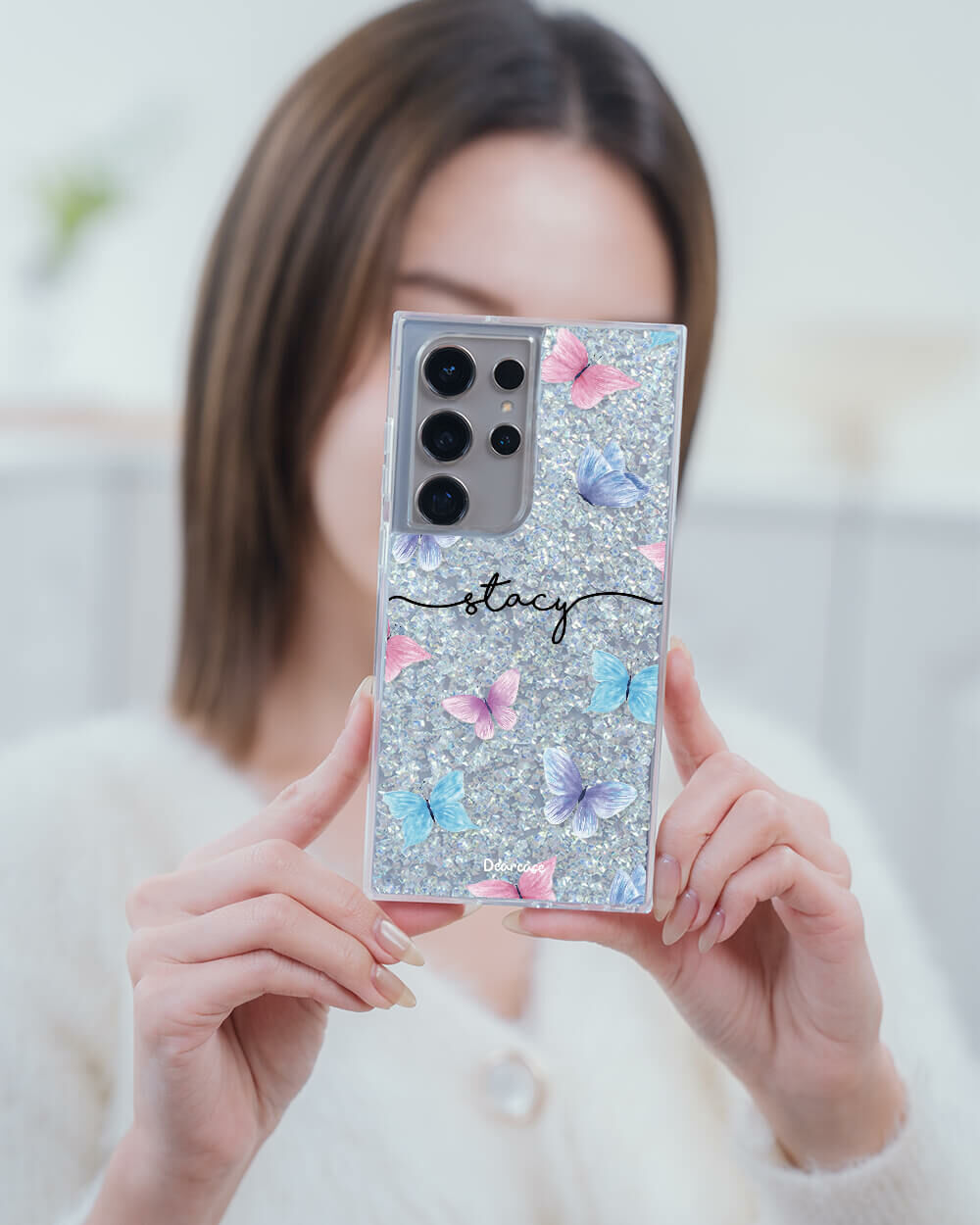 玫粉蝴蝶 銀耀貝拉殼 - (訂製名字) - Samsung 三星 客製化手機殼
