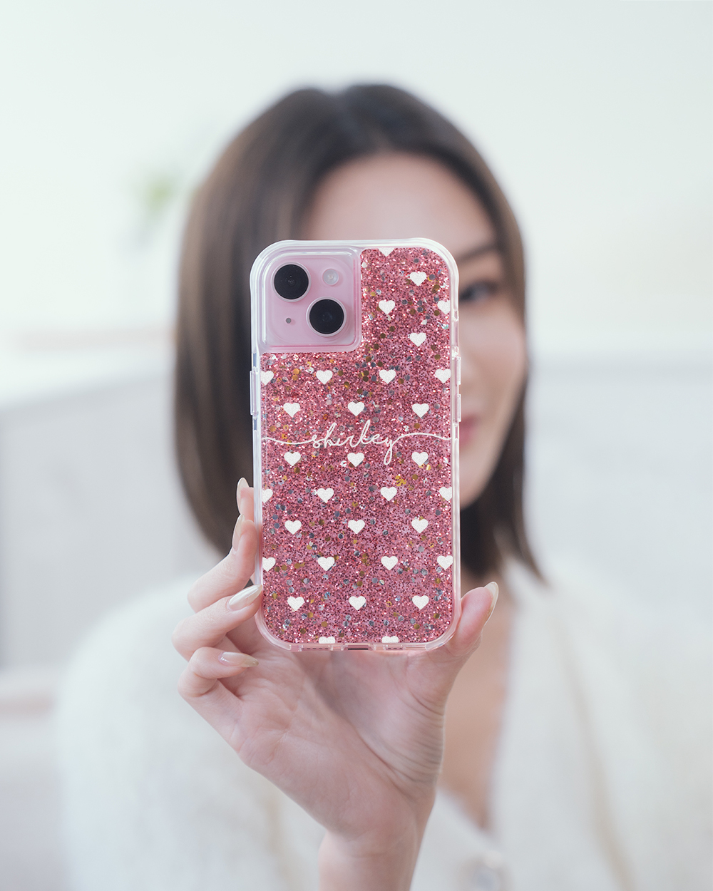 白色愛心 粉耀撞白殼 - (訂製名字) - iPhone 客製化手機殼