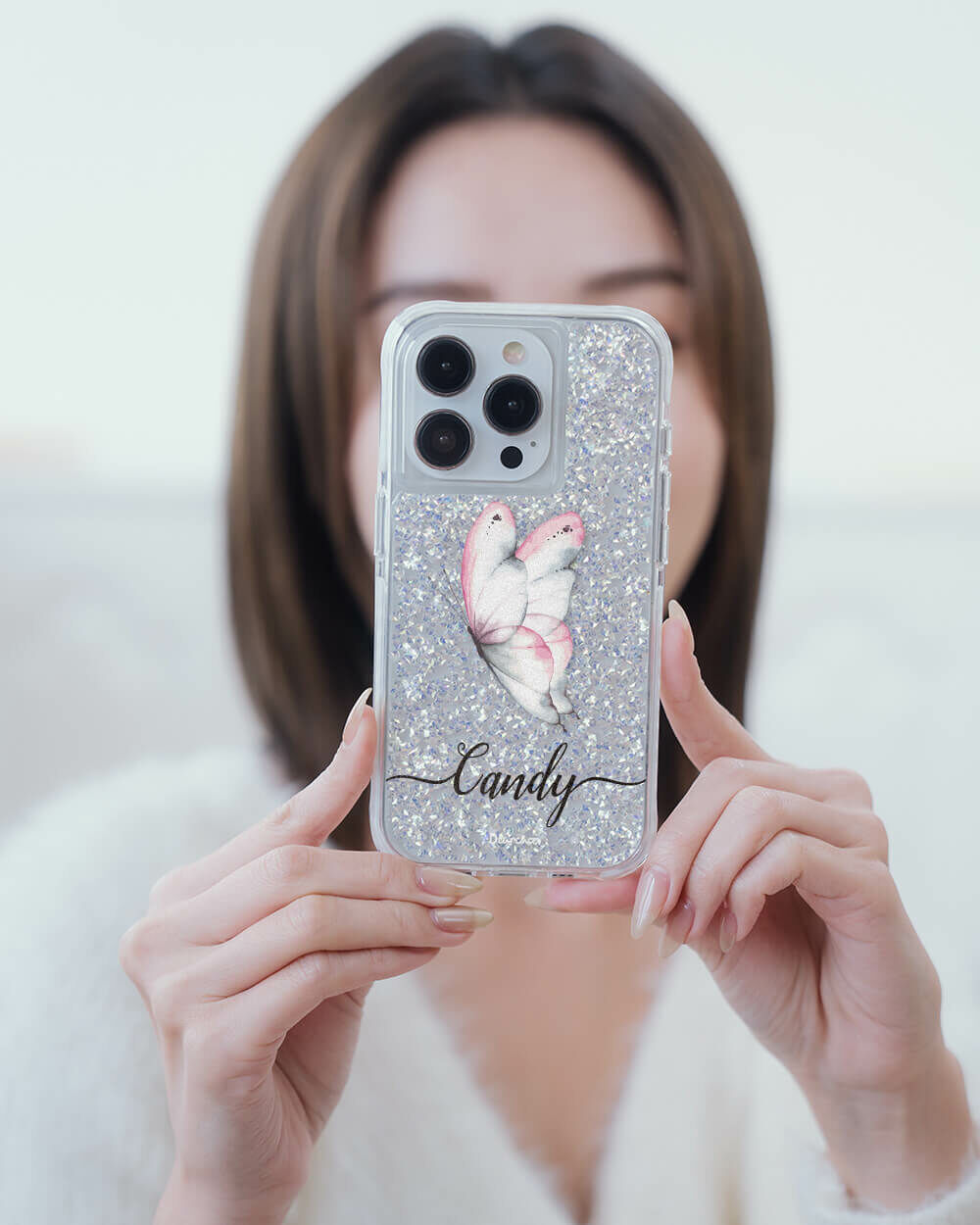 夢幻粉蝶 銀耀撞白殼 - (訂製名字) - iPhone 客製化手機殼