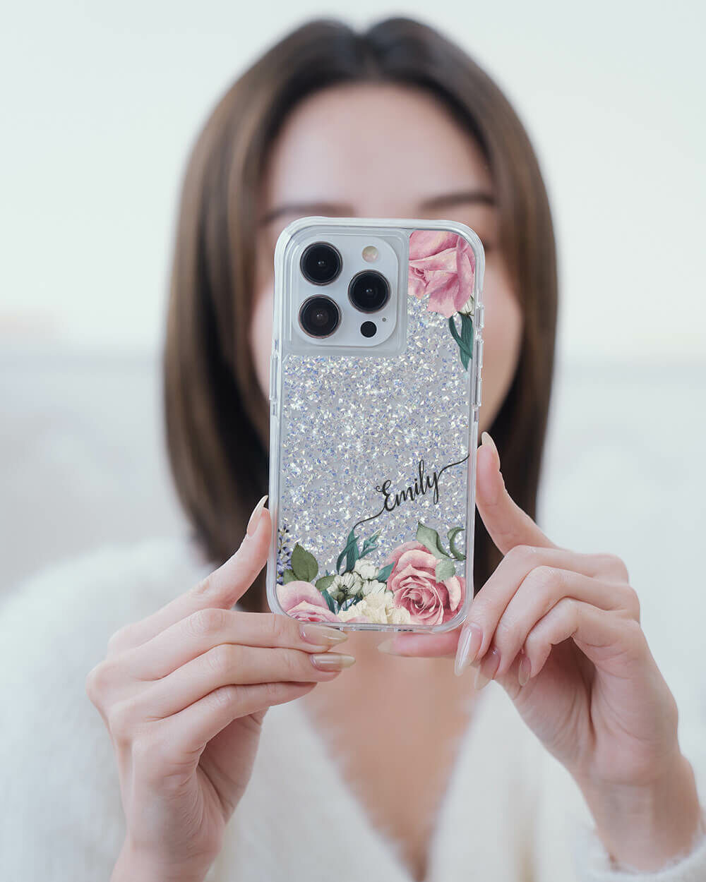 淡粉玫瑰 銀耀撞白殼 - (訂製名字) - iPhone 客製化手機殼